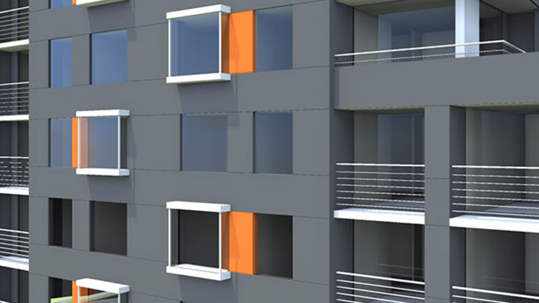 El volumen alargado sigue la forma del predio, con dos grandes pantallas longitudinales de color grafito, que enmarcan las esbeltas fachadas frontales de color naranja con franjas entremezcladas. En las fachadas longitudinales, el juego de bow windows salientes y alternados, con los balcones entrantes le dan movimiento al conjunto.
