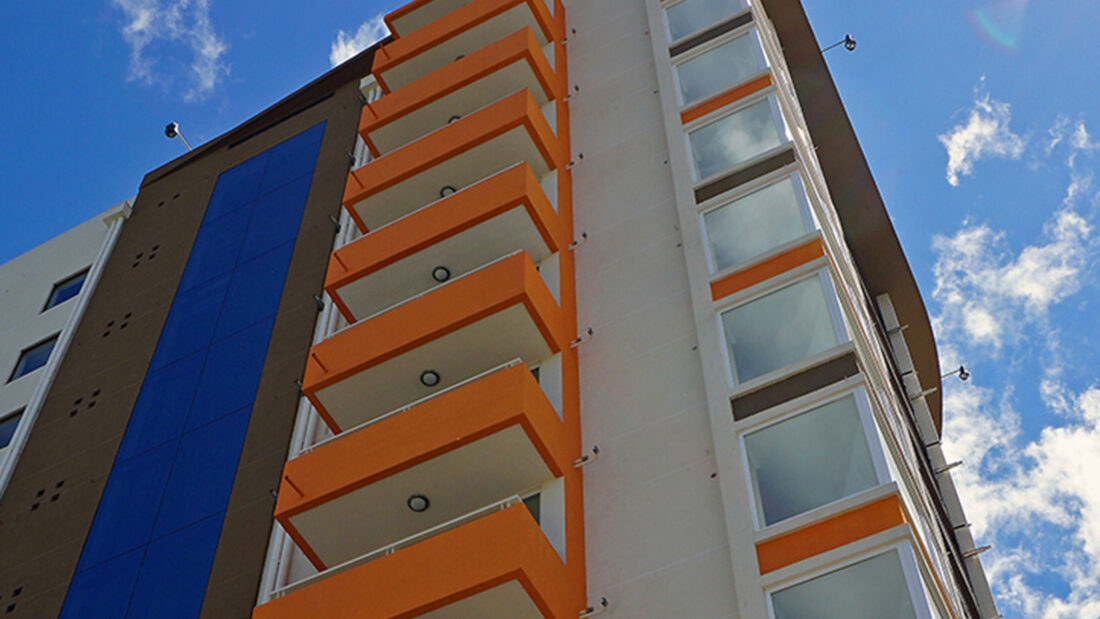 El aprovechamiento de la altura máxima generó una cubierta plana, que se remata con generosos aleros en volado de losas de hormigón armado, con los cuales se logra dar remate al volumen, a manera de una mega cornisa para el nivel de peatón.